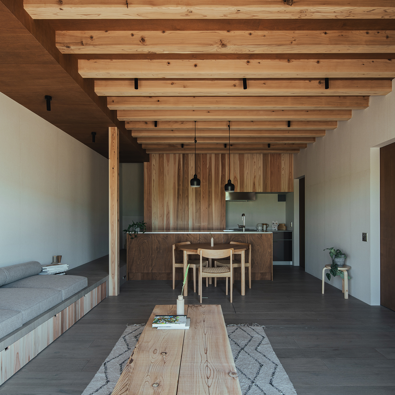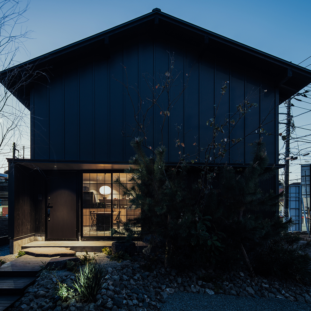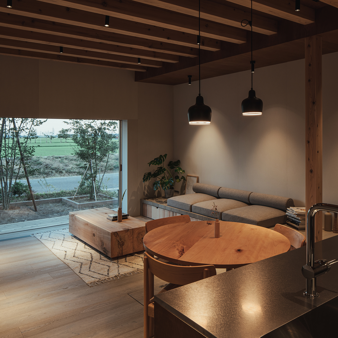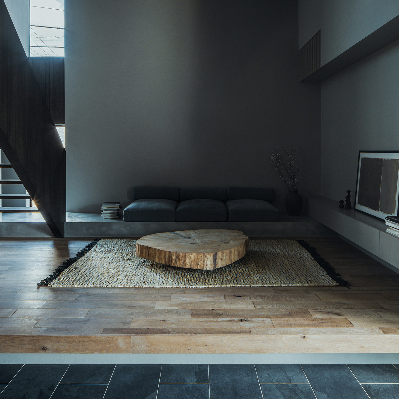 日本の伝統的な文化や美意識を再編集して生まれたモデル「JP」。扉を開けた瞬間広がるのは、ダイニングとしての土間。天高約5mのリビングルームを抜けた先の階段から覗く借景が時の季節の移ろいを美しく感じさせます。